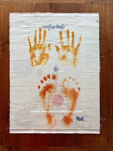 【No★P8869】泰国东北“法宗派名师”~86岁龙普布瓦萨「第一期头帮」手印脚印布符!手印脚印是师傅亲自用草药盖上(不是印刷)!用大法会“盖佛牌圣物加持”的布制作!